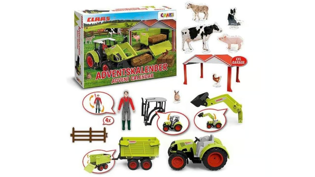 Cu Calendarul de Advent Claas Craze, se creează un set complet de joacă cu standuri și clădiri, la fel ca un set de construcție DIY.