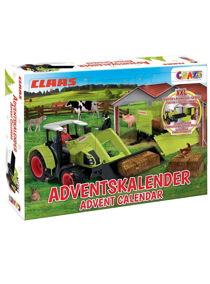 La remorca cu două axe Claas, spatele și cele două plăci laterale pot fi rabatate. Copii vor adora acest calendar advent cu elemente detaliate din ferma.