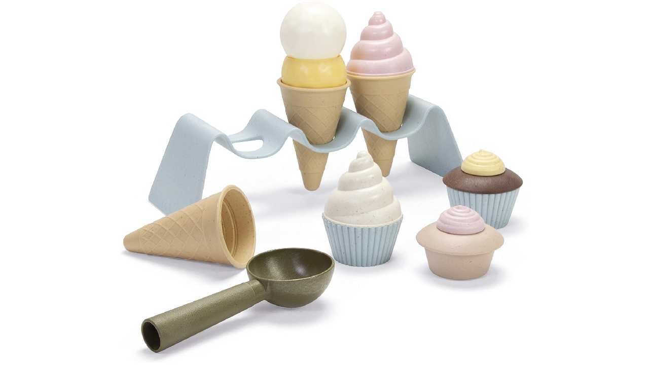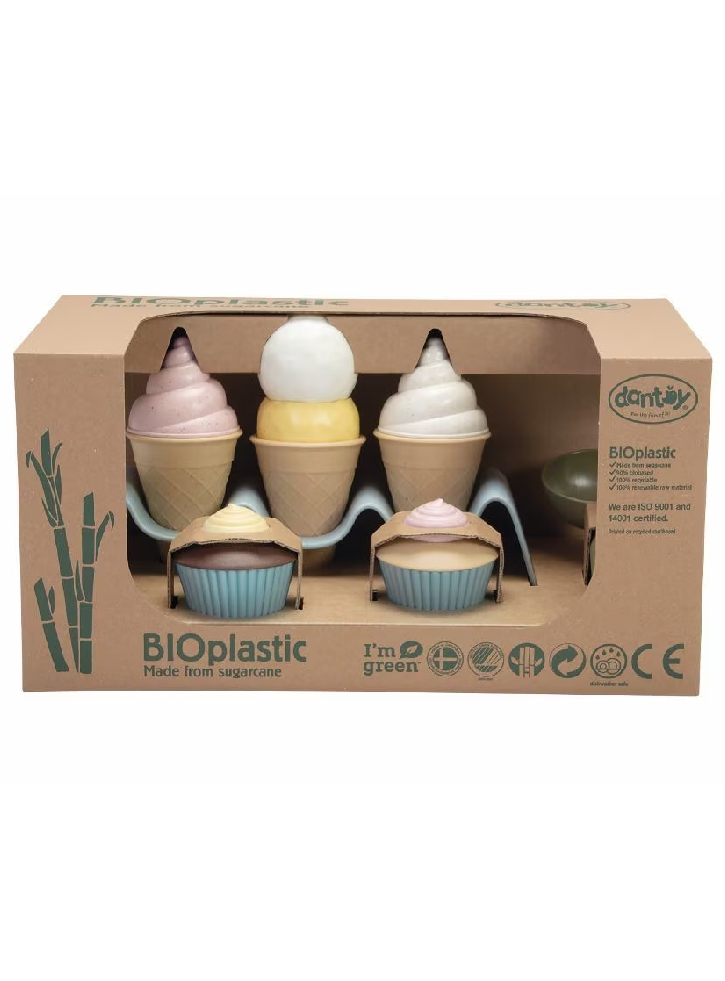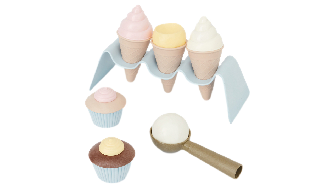 Delicios set de joacă cu înghețată din 15 piese de la Dantoy, în culori naturale, în culori naturale, fabricat din bioplastic Nordic Swan cu etichetă ecologică.