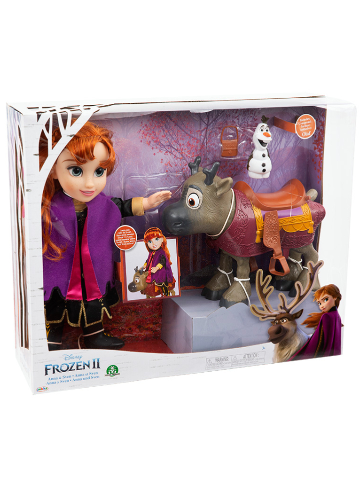 Include: 1 păpușă Anna din Frozen 2 cu geantă înaltă, 1 personaj ren Sven, 1 personaj Olaf.