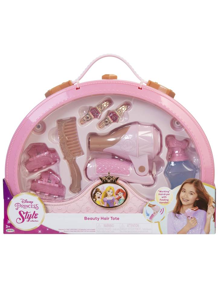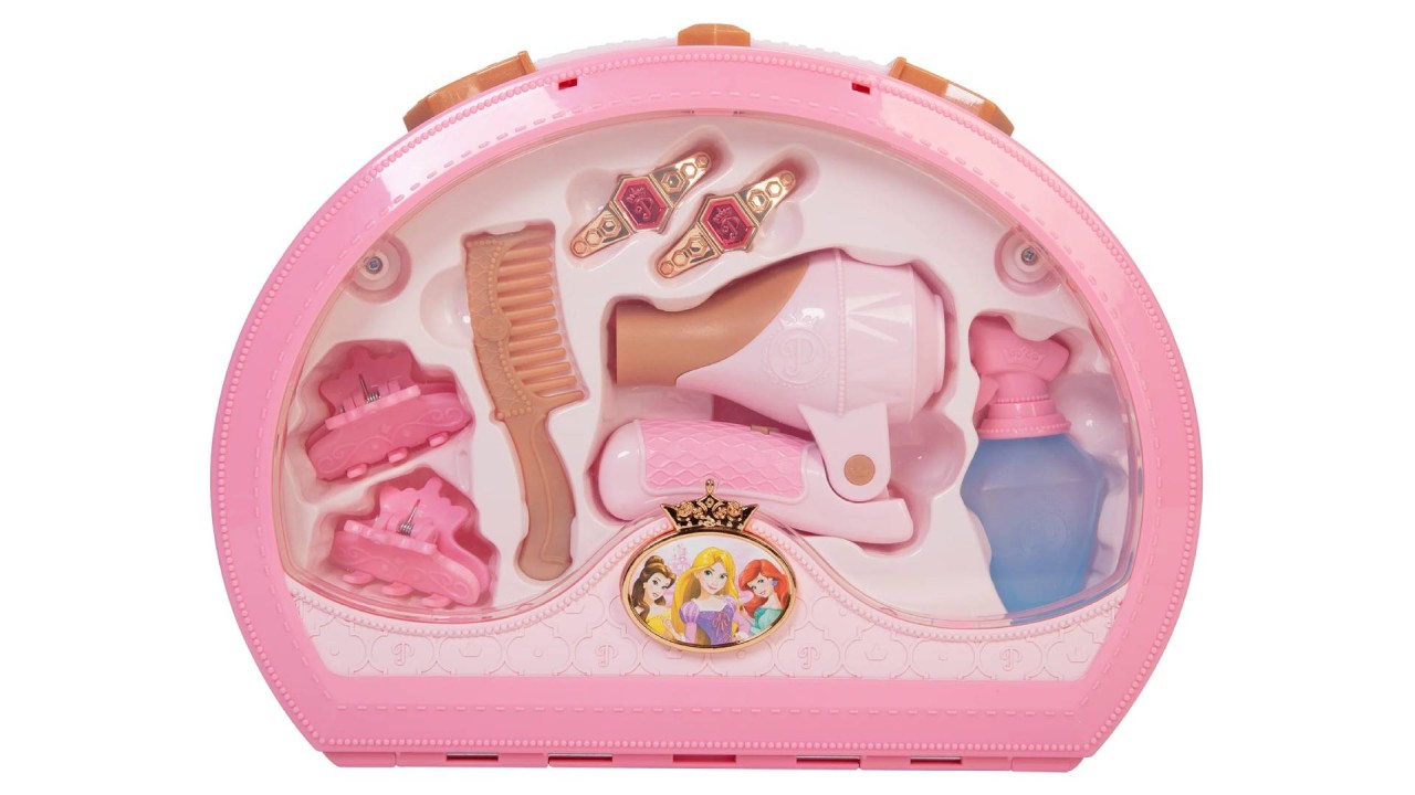Also includes a toy perfume bottle with atomizer, a toy mascara tube with applicator and a toy gloss with applicator.