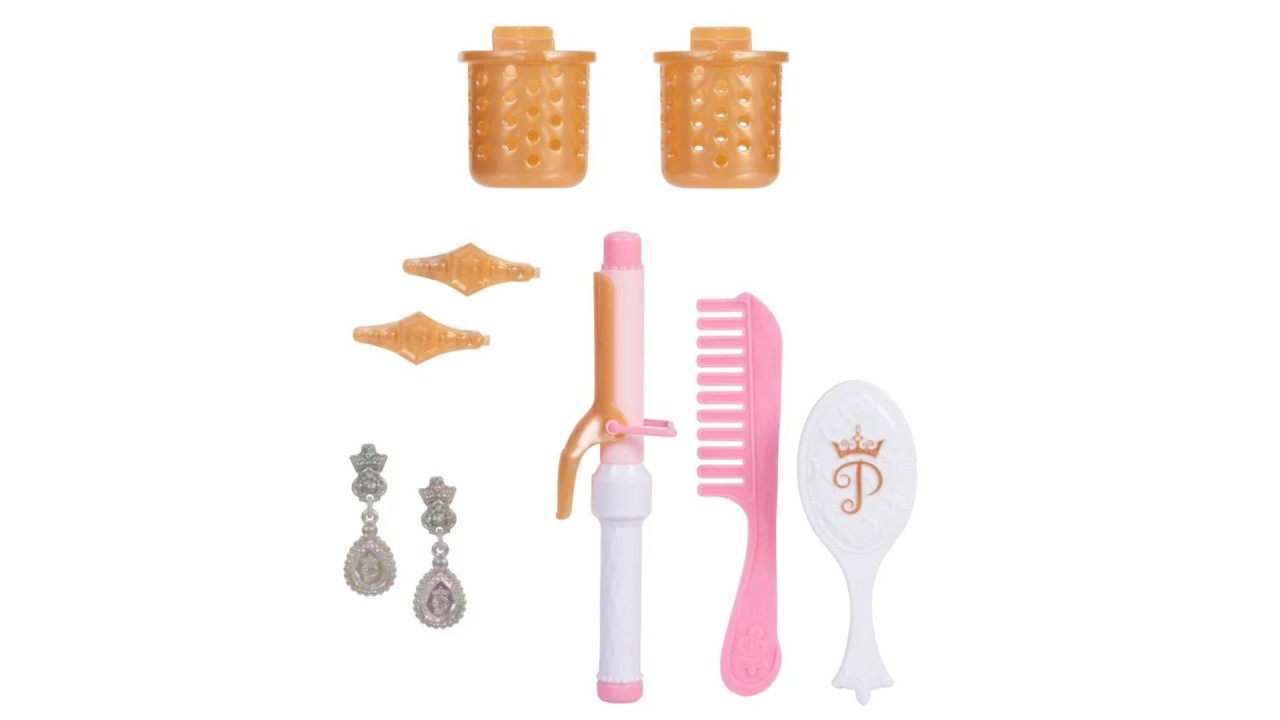 Press the Princess cameo to turn on the LED lights and get ready for an evening with the curling iron, brush, comb and rods that can be conveniently organized in the hanging storage baskets.