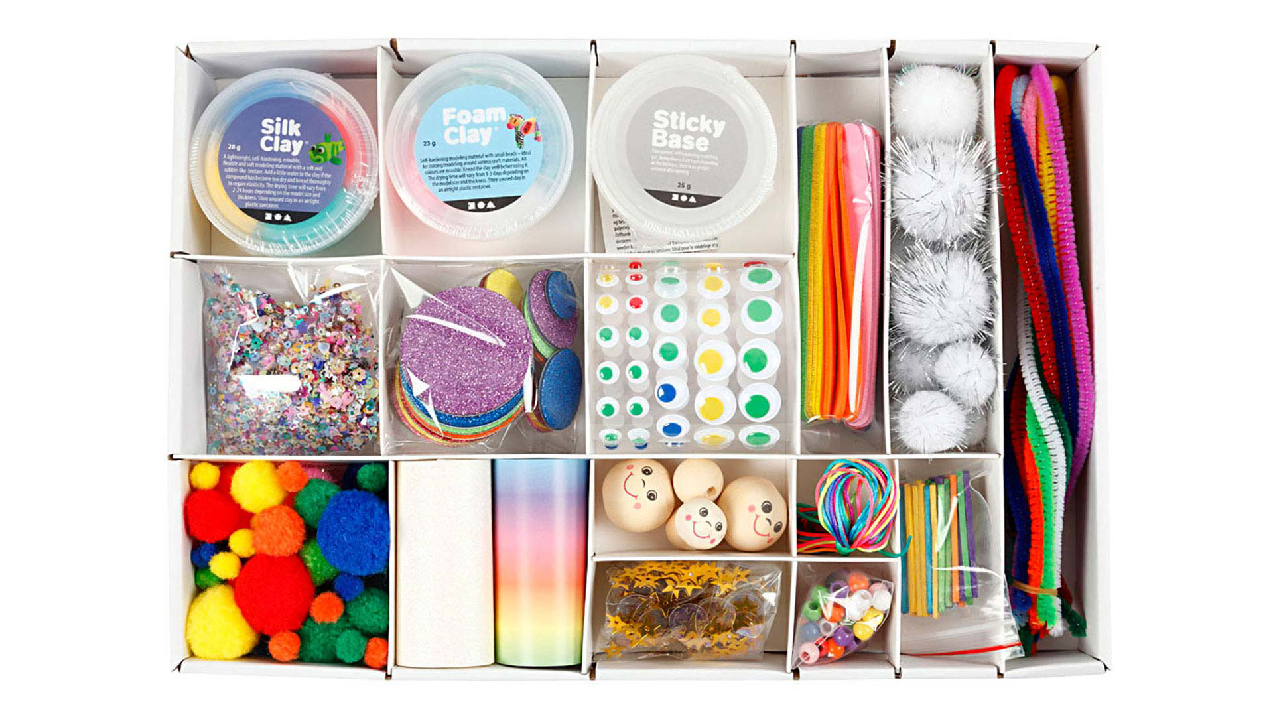 Contents: Foam Clay, Silk Clay, Sticky Base, small sequins, pom poms, printed paper, self-adhesive curling eyes, wooden face beads, nylon cord, plastic beads, EVA foam figures with glitter, popsicle sticks of various colors , matches, pipe cleaners and glitter pompoms.