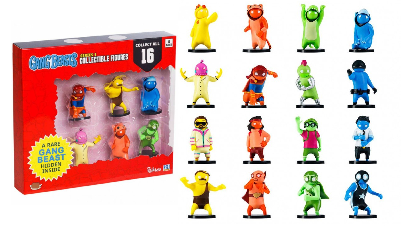 Colecționează toate cele 16 figurine Gang Beast, toate pozate într-o fotografie de acțiune dinamică pentru distracția și bucuria ta.