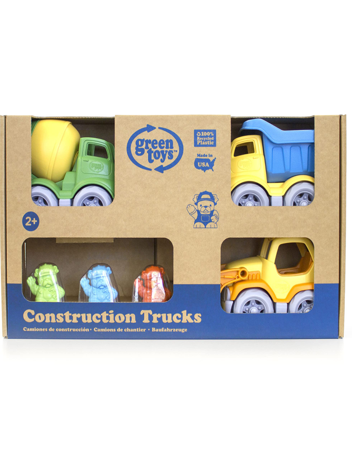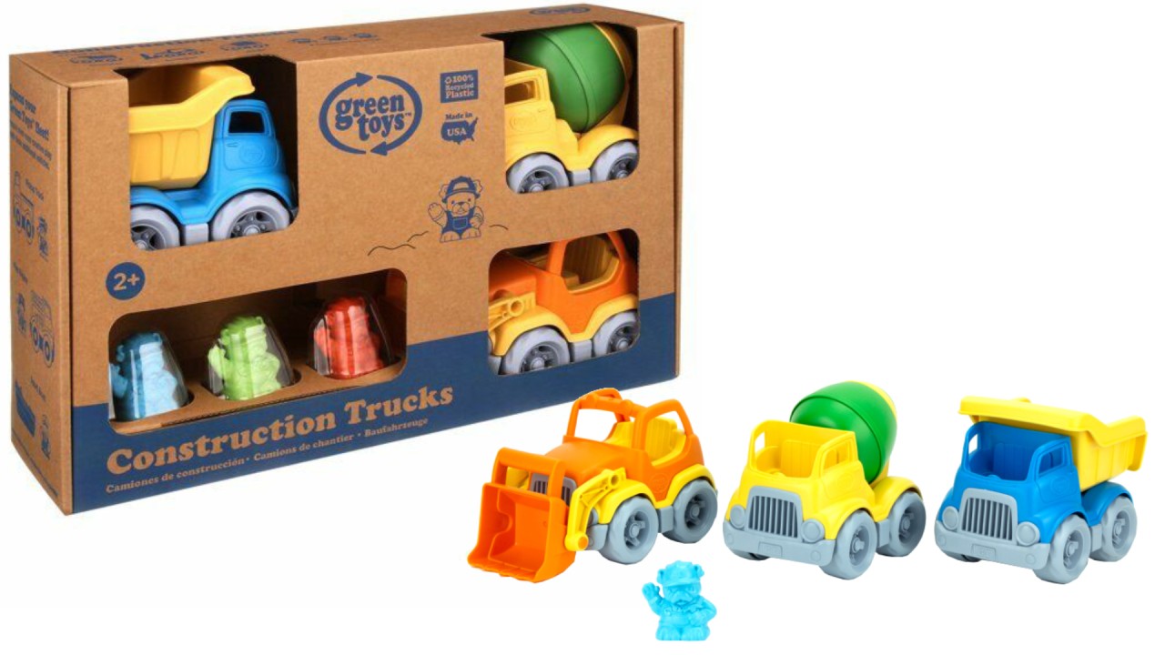 Fabricată din plastic 100% reciclat, fără BPA, ftalați sau PVC, setul include: 1 Scooper cu un încărcător frontal mobil, 1 Mixer cu tambur rotativ, 1 Dumper cu un pat clasic cu cutie deschisă.