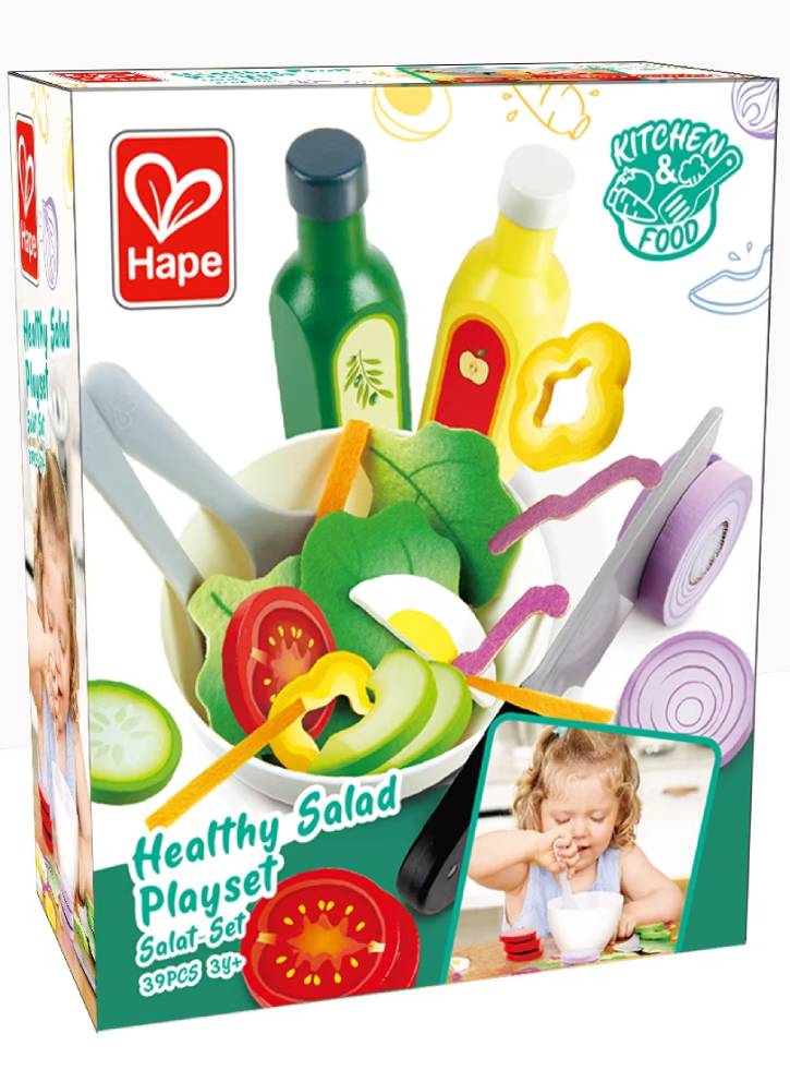 Include bucăți de ou, avocado, castraveți, roșii, ceapă și alte legume care pot fi feliate folosind cuțitul de joacă realist.
