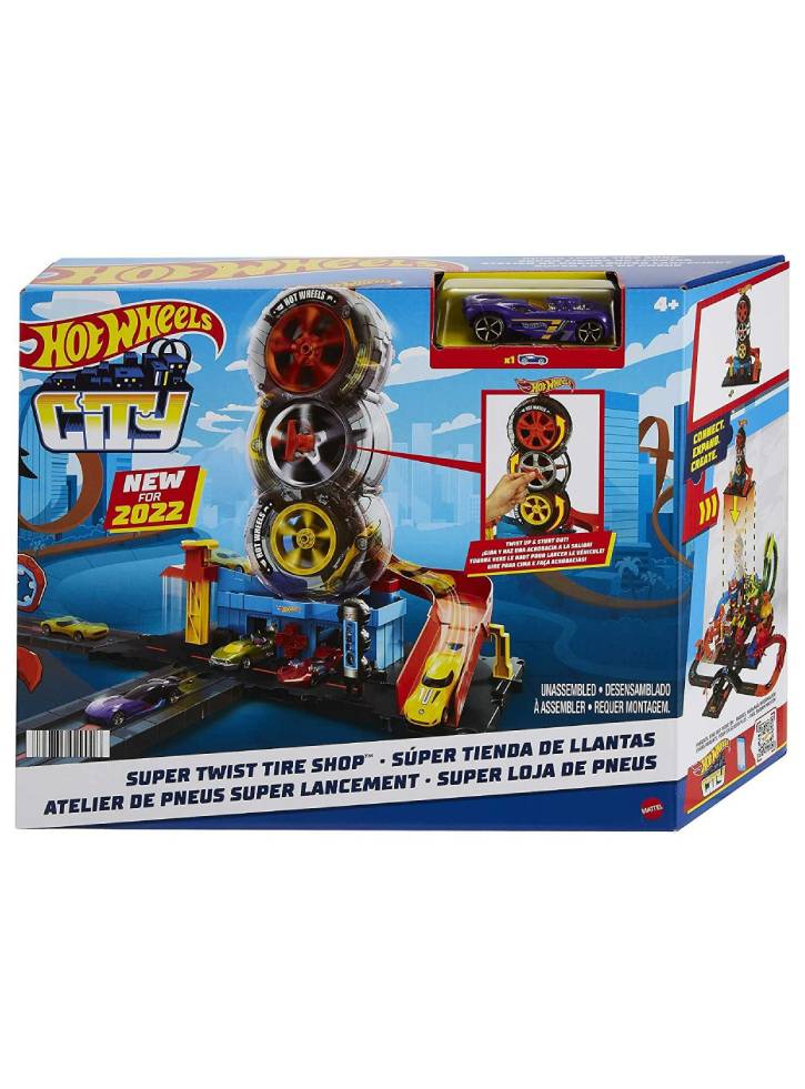 Copiii abordează mai multe răsuciri și viraje în magazinul de anvelope Hot Wheels City Super Twist în timp ce învârt cheia centrală și își mișcă mașinile printre roțile translucide ale magazinului.