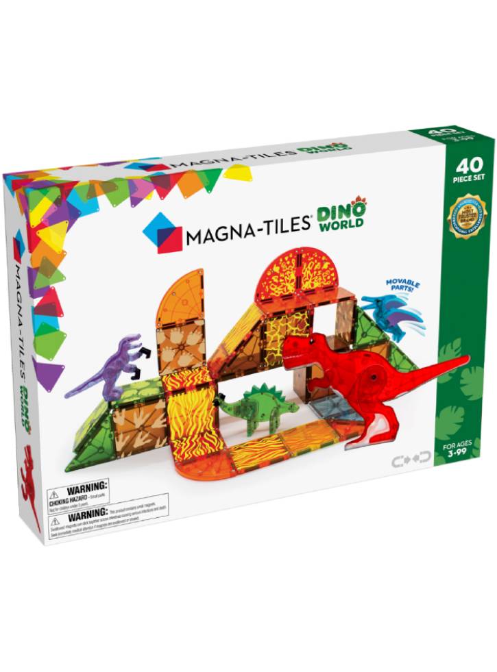 Setul Dino World cuprinde patru dinozauri supradimensionati, complet magnetici si placi viu colorate, cu tematica vulcanica, pentru un potential de joaca care nu se stinge niciodata.