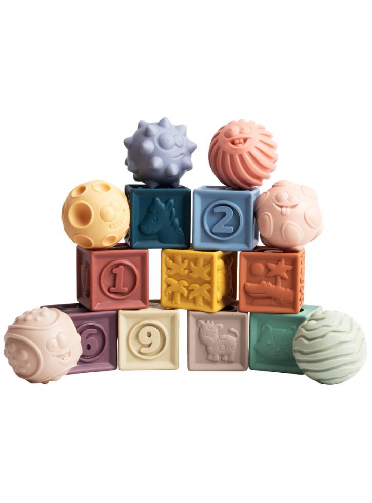 The set consists of 9 stacking blocks and 6 massage balls.