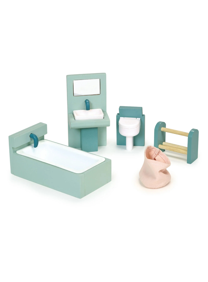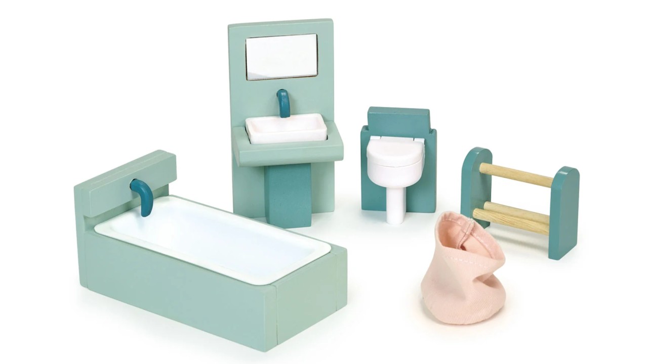 Acest set de mobilier din lemn pentru casa de păpuși include o toaletă, o cadă, o chiuvetă cu oglindă, un suport pentru prosoape, un coș de rufe din țesătură.