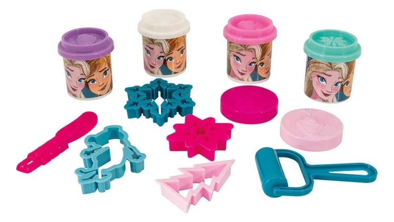 4 vase de aluat Frozen de 50g fiecare, în 4 culori diferite, te așteaptă să le combini și să le modelezi în orice design dorești.