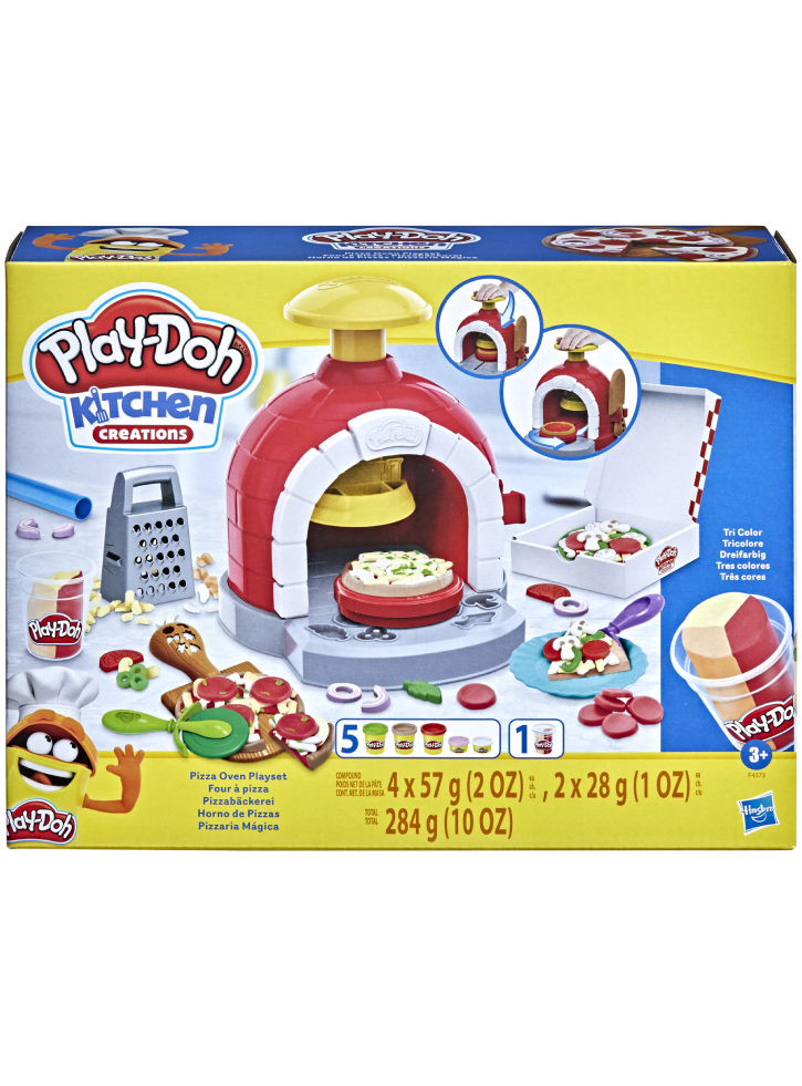 Include: cuptor de pizza de jucărie, răzătoare de brânză, paletă de pizza, feliator, cutie de pizza, unealtă de servit, rolă, 2 farfurii, 1 cutie de plastilină tricoloră Play-Doh și 5 cutii de plastilină marca Play-Doh.
