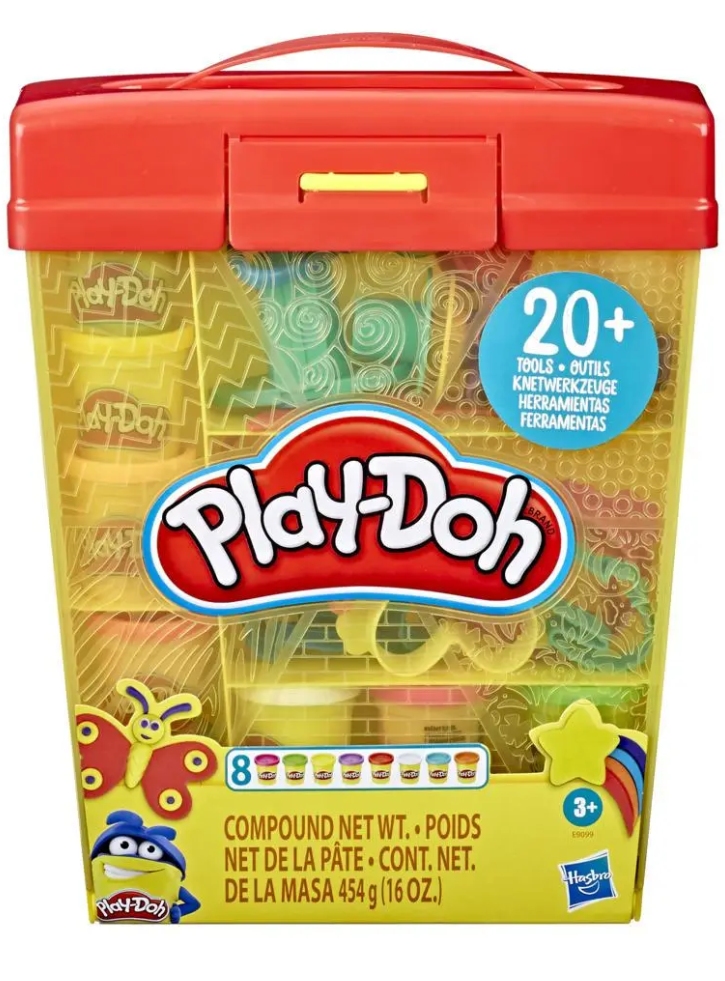 Are peste 20 de instrumente clasice Play-Doh, 8 culori și o cutie de depozitare care se dublează ca suprafață de joacă.