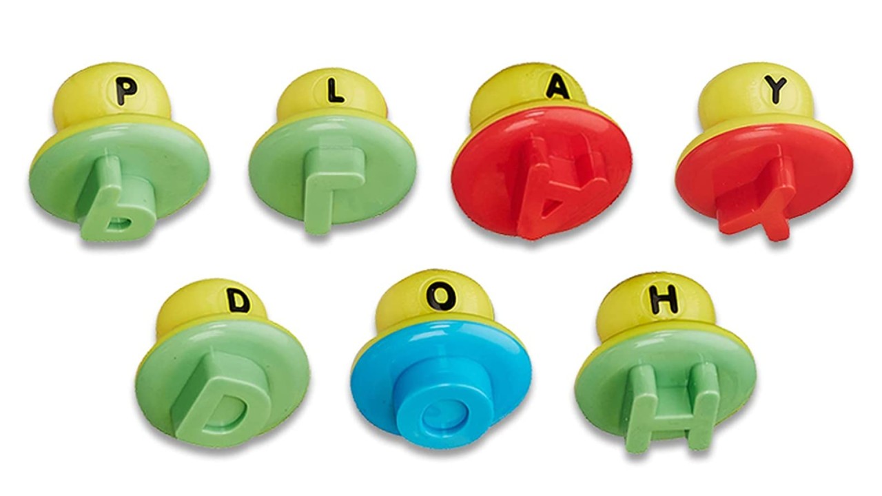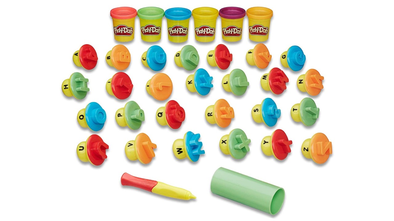 Concepute pentru copii ștampilele groase și stiloul sunt ideale pentru ca mânuțele mici să ștampileze și să scrie litere în compusul Play-Doh, în timp ce își exersează abilitățile motorii.