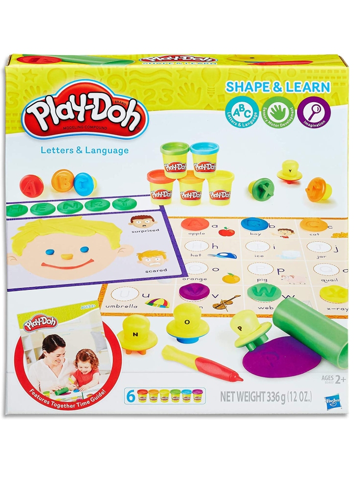 Include 26 de ștampile cu litere, stylus, rolă, 2 covorașe de joacă cu două fețe, Ghidul Together Time și 6 cutii de compozit de modelare marca Play-Doh.