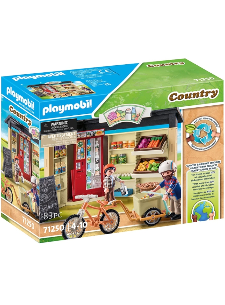 Setul include standul fermei,2 figurine( adult și copil), o bicicletă cu remorcă, mai multe cutii de lapte și suc, conserve asortate, legume asortate si ladă frigorifică.