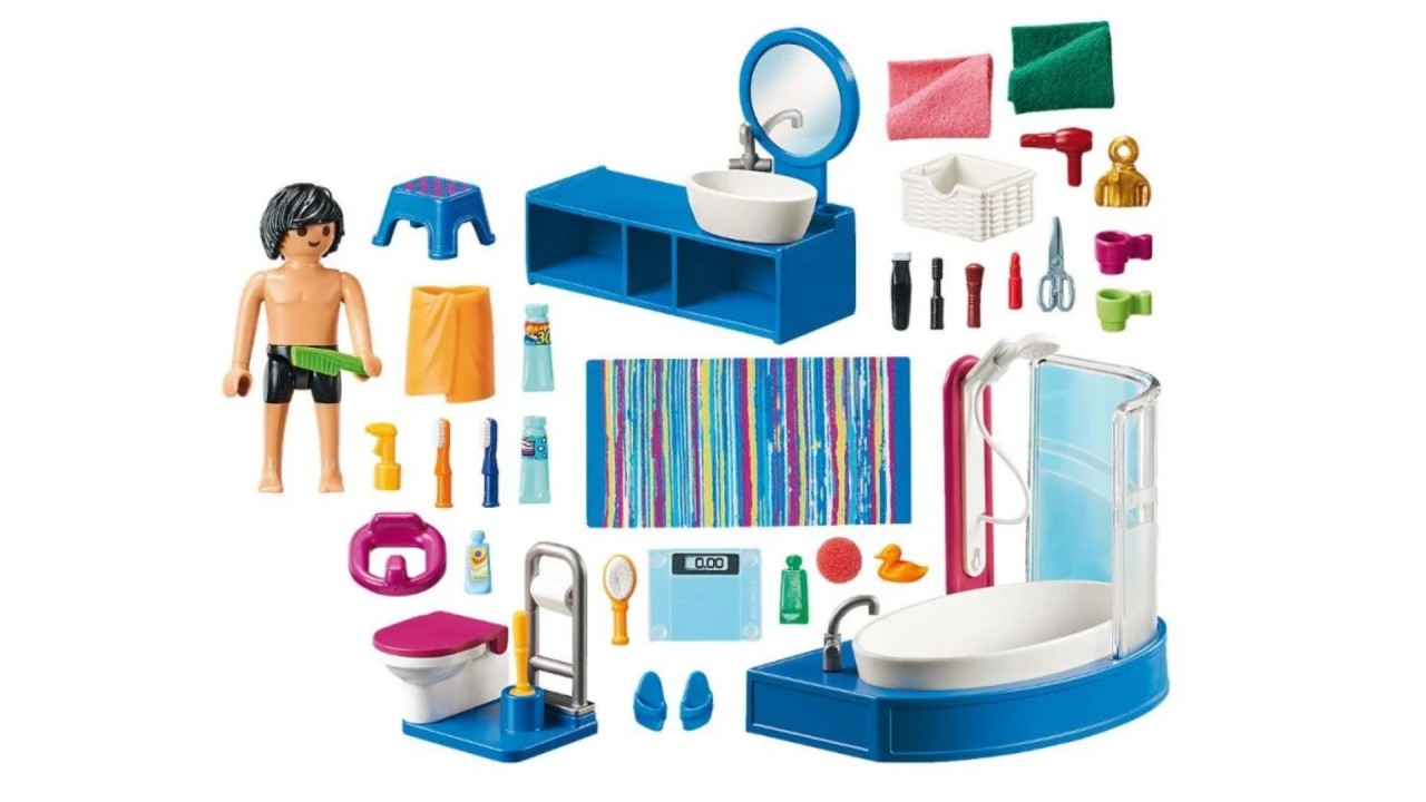 Setul include: o figurina, o chiuvetă mare cu oglindă și depozitare, o toaletă, o cadă, un covor oval, un scaun, un uscător de păr, o periuță de dinți, o pastă de dinți și alte accesorii.