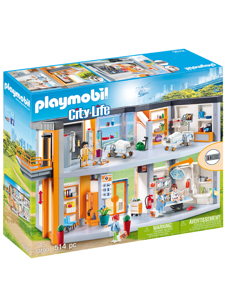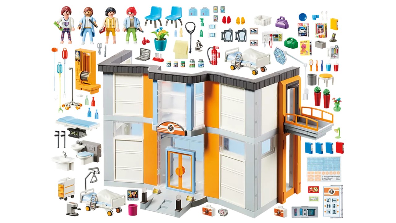 Setul include patru figurine, clădirea spitalului, dispozitive medicale, paturi rulante pentru pacienți, mobilier pentru camera pacienților, fișe medicale, cărucior medical, stâlp pentru perfuzii și multe alte accesorii.
