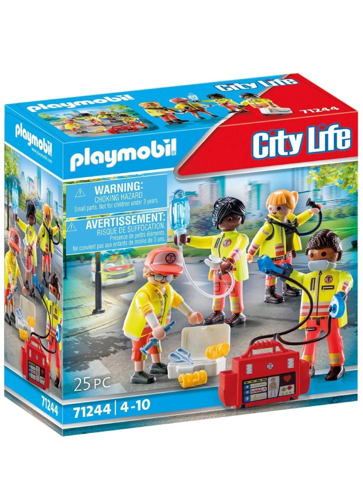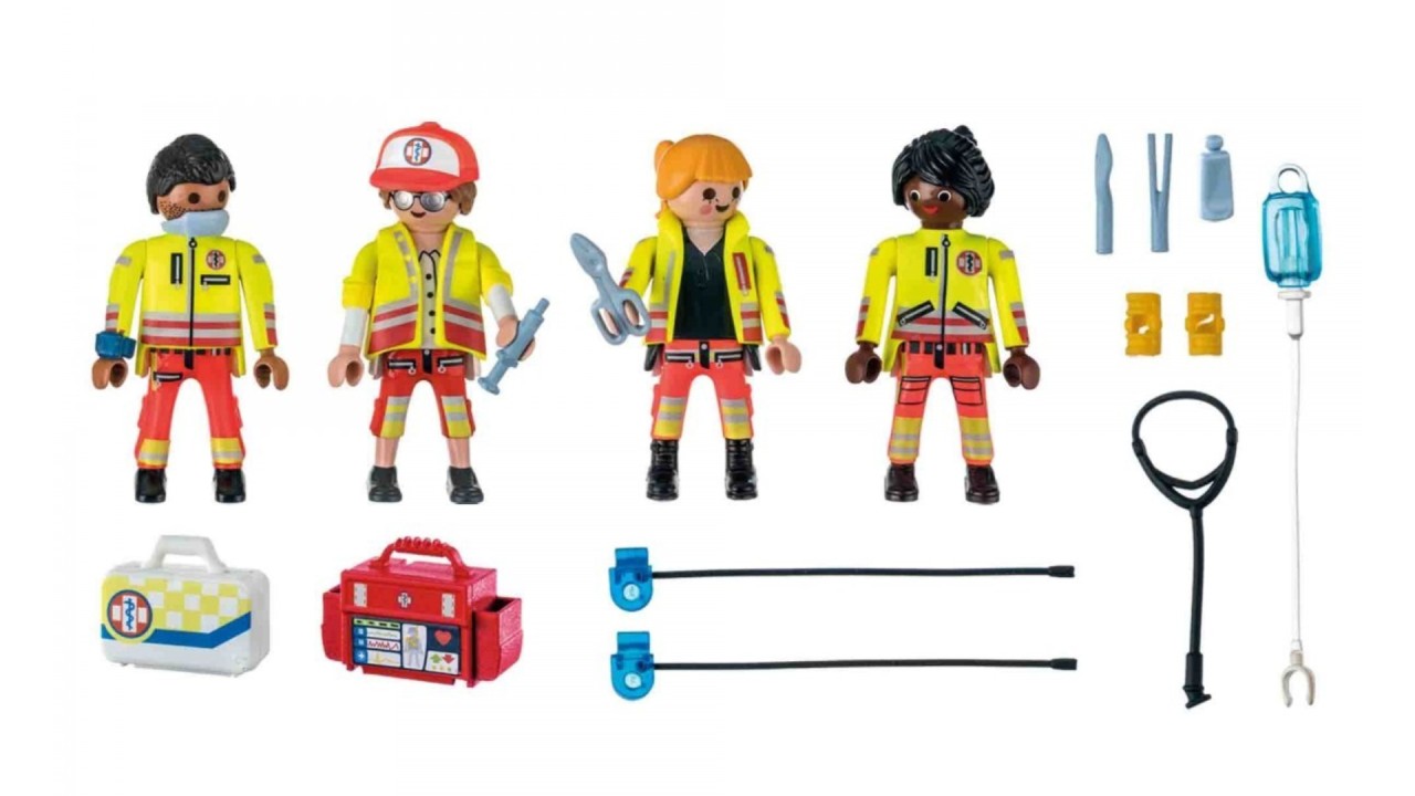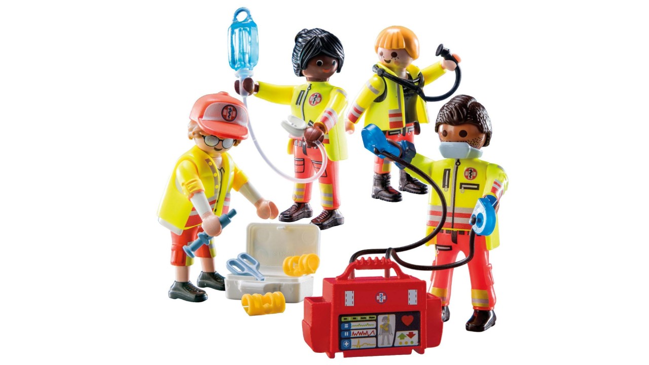 Echipa de salvare Playmobil a venit cu echipamentul lor extins pentru îngrijirea pacienților la locul accidentului. Pachetul include si o geanta nouă pentru defibrilator.