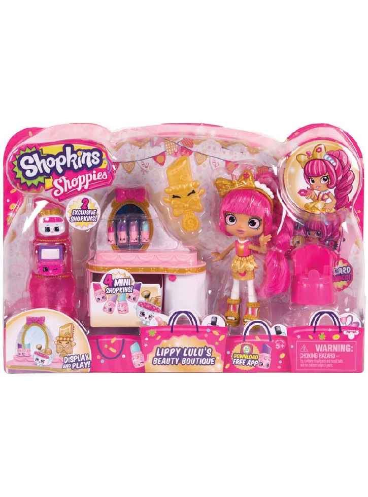 Setul de joacă include o masă și un scaun de toaletă, o vitrină de ruj, 2 personaje Shopkins și 4 mini Shopkins, o perie și un elastic de păr - tot ce este necesar pentru a te pregăti pentru o petrecere.