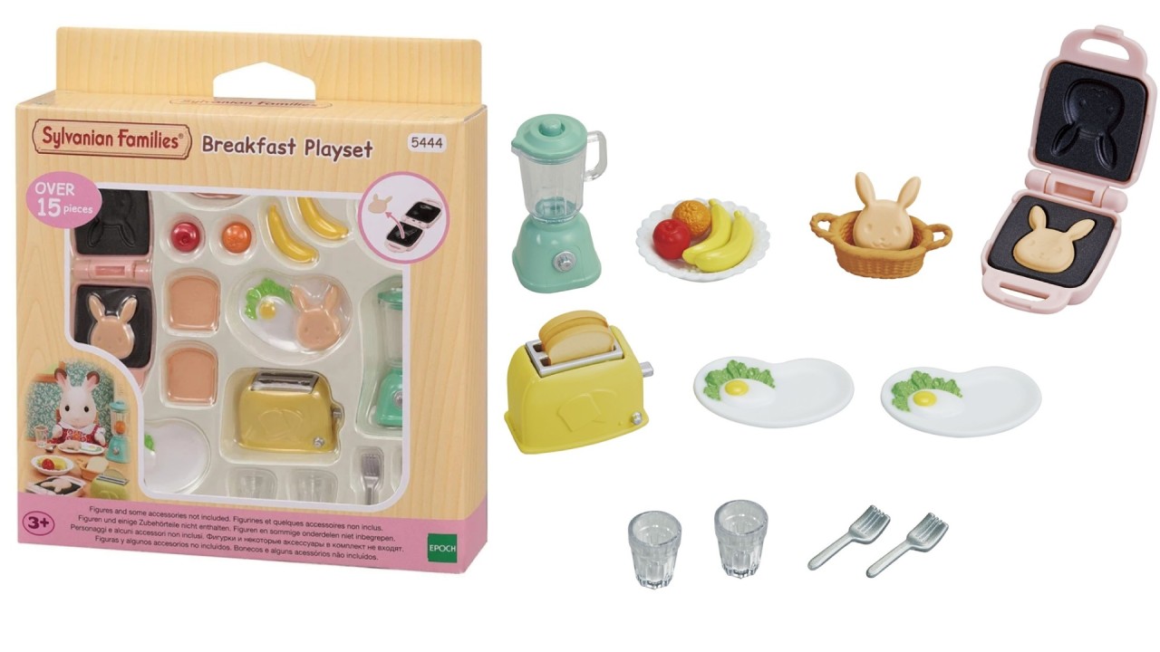 Setul de joacă pentru mic dejun Sylvanian Families include micul dejun și ustensile de gătit.