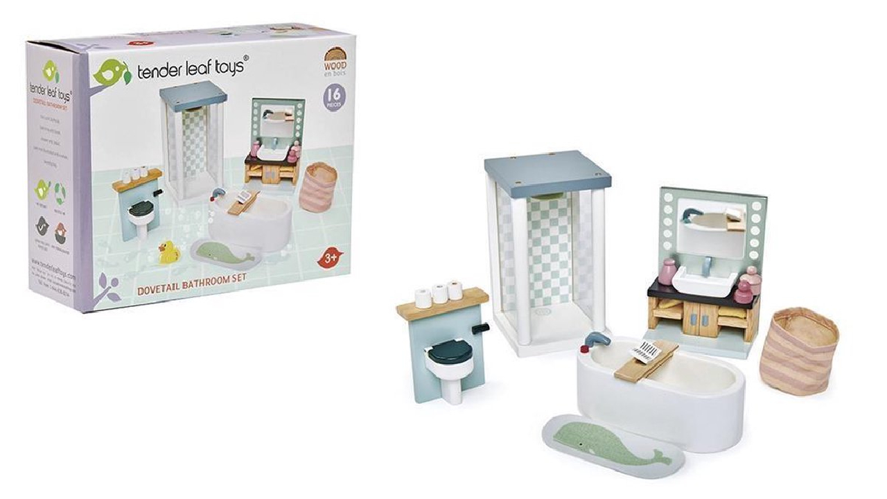 Acest set de mobilier cu mobilier de baie de la Tender Leaf Toys completează fiecare casă de păpuși din lemn.