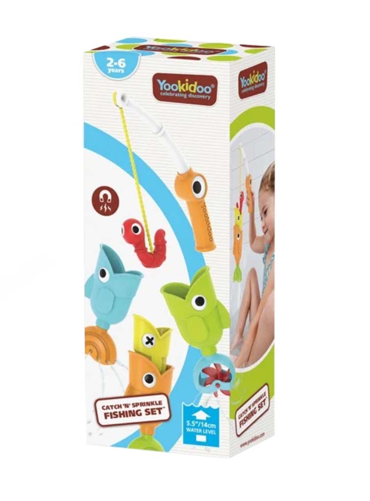 Include: 1 undiță de pescuit cu cârlig magnetizat în formă de vierme, 3 pești magnetici cu diverse surprize și efecte de apă.