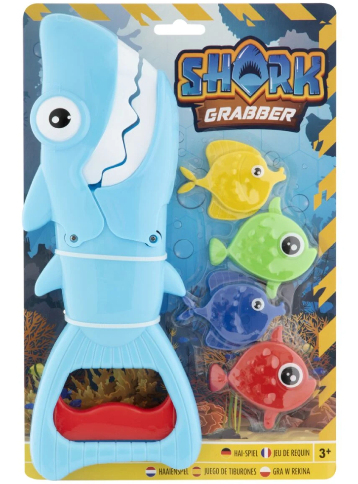 Rechinul cu o lungime de 30 cm este echipat cu un mecanism de prindere, permițându-le copiilor mici să prindă cu ușurință patru peștișori colorați, fiecare cu o lungime de 7 cm.