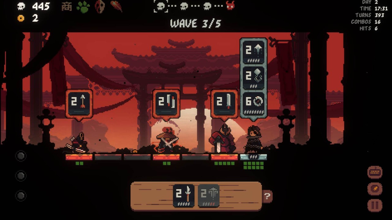 Shogun Showdown este un joc de luptă pe ture cu elemente de tip rogue-like și de construire a pachetelor.