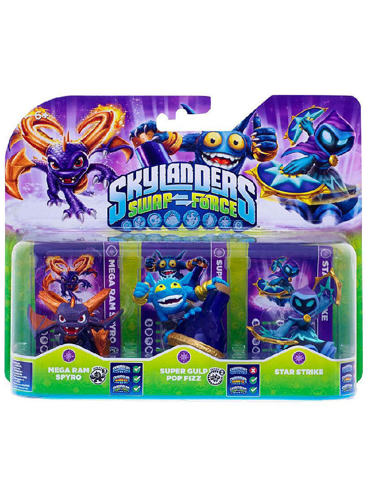 Pachetul triplu Skylanders SWAP Force Magic Triple Pack vine cu trei personaje din grupul elemental Magic, inclusiv Star Strike, Mega Ram Spyro și Super Gulp Pop Fizz.