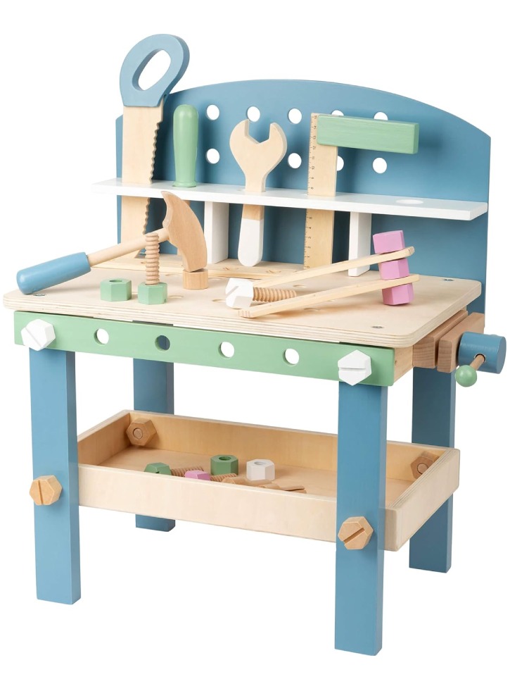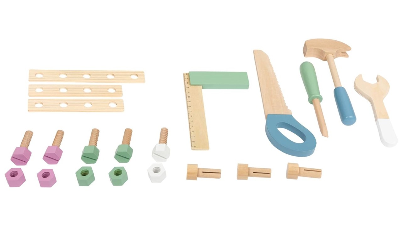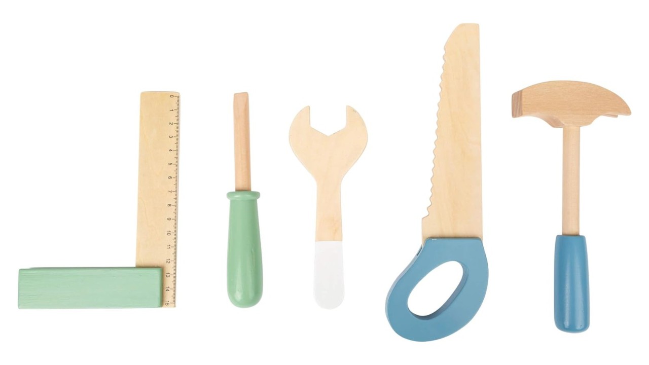 Setul include 5 unelte din lemn: un ciocan o cheie, o șurubelniță, un clește papagal și o clemă pentru șuruburi, împreună cu accesorii extinse pentru a aborda orice lucrare cu ușurință.