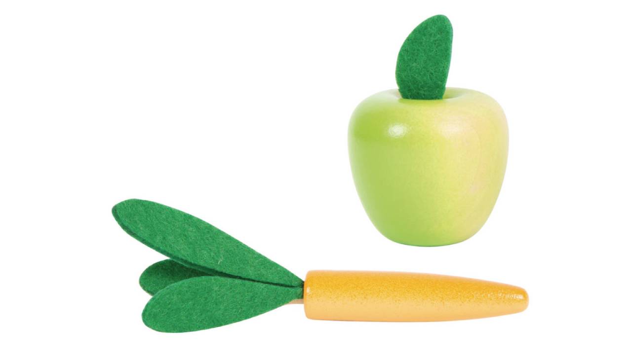 Și, desigur, mărul și morcovul din lemn sunt de asemenea esențiale! Vine cu o panglică de turneu pe care copiii o pot atașa la frâul calului sau la propriile haine.