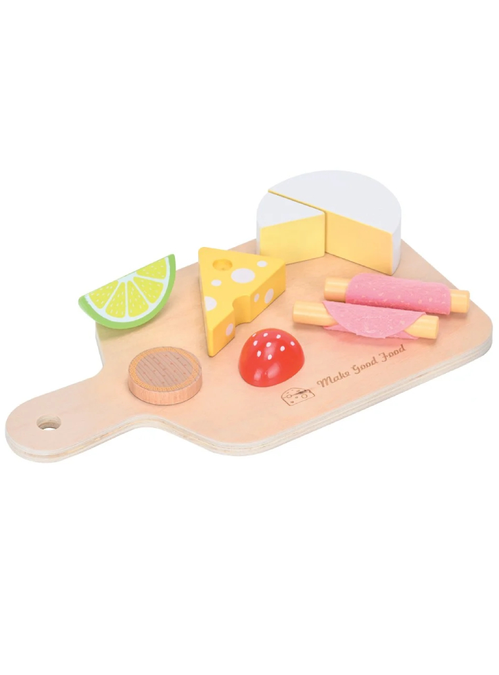 Setul include o placă de tăiat, pâine, brânzeturi, șuncă, căpșuni, cârnați și lime, toate perfecte pentru jocul imaginativ și gătitul creativ.