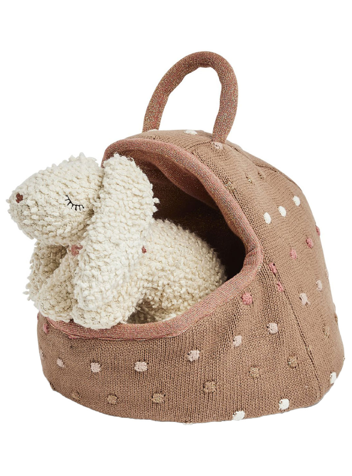 Iepurele vine într-o peșteră confortabilă din calitate tricotată maro cu puncte multicolore.