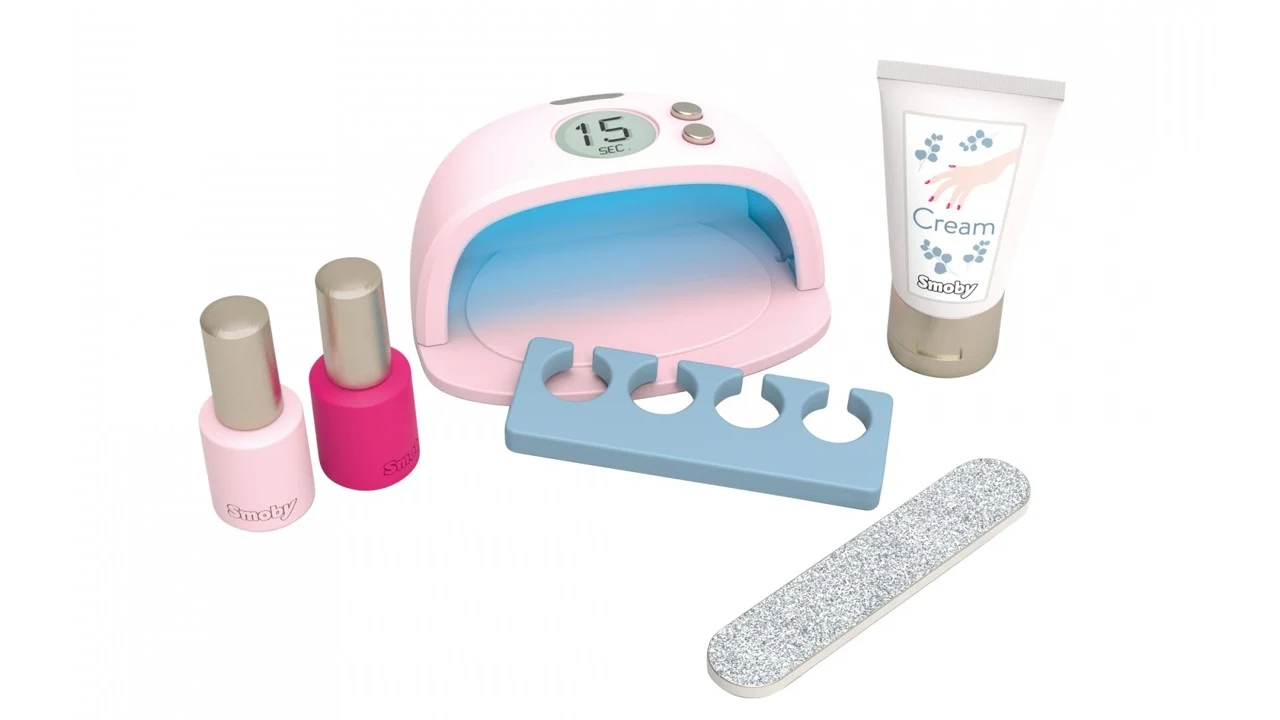 În plus față de lampa UV, setul de frumusețe include o pilă de unghii strălucitoare, separator de degete, ambalaj pentru cremă de mâini și ojă de joacă în roz.