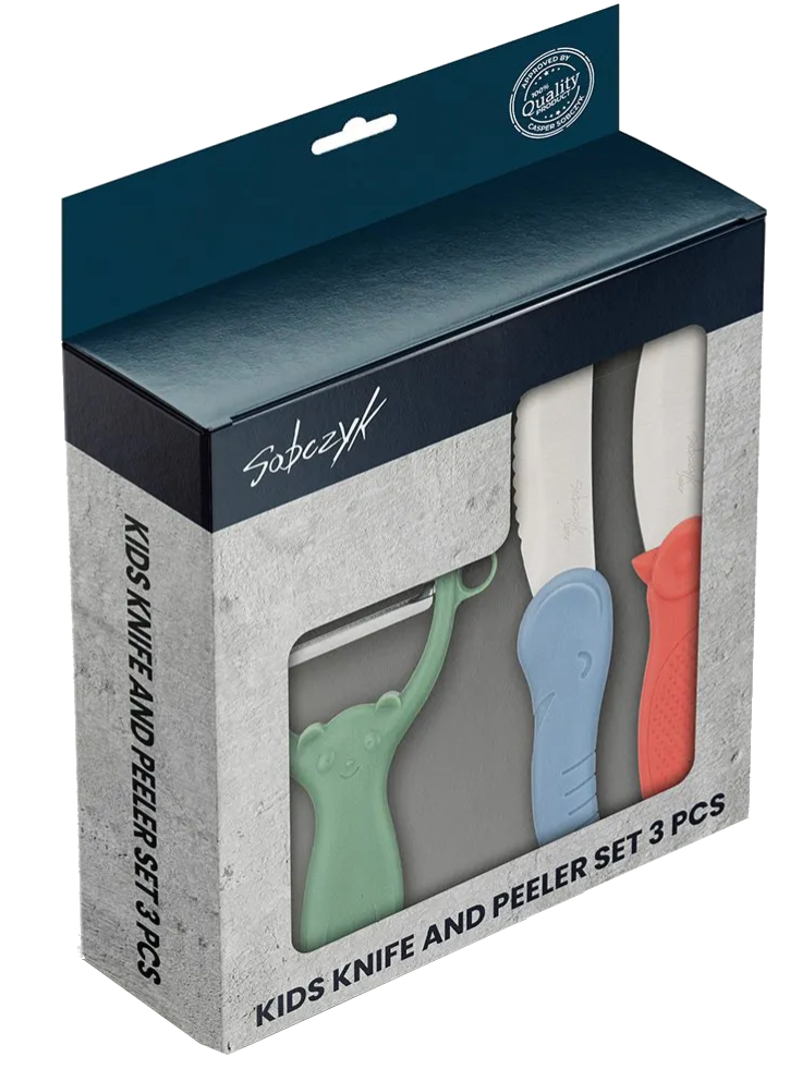 Aceste cuțite și decojitoarea Sobczyk au fost concepute special pentru cei mici ca să poată ajuta în bucătărie.