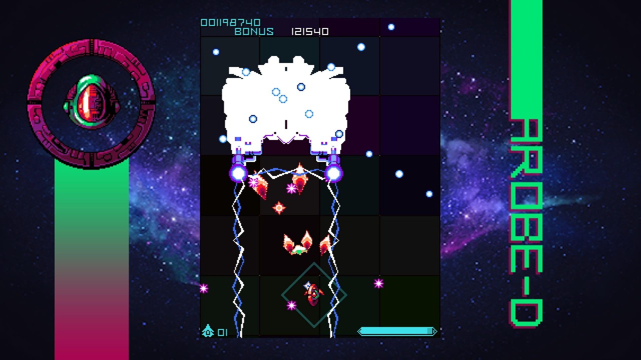 In Sophstar, the best way to get a high score is to destroy enemies up close to pick up the chips they drop.