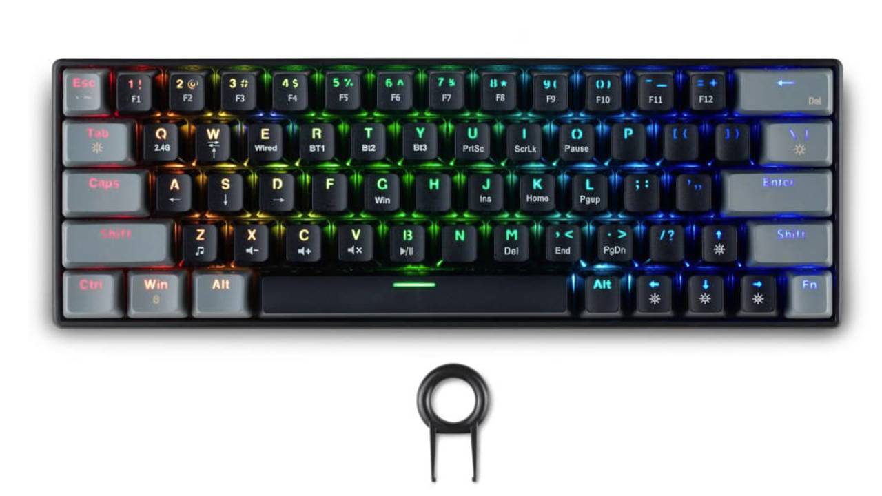 - 64-key RGB mini mechanical keyboard with red switches.
