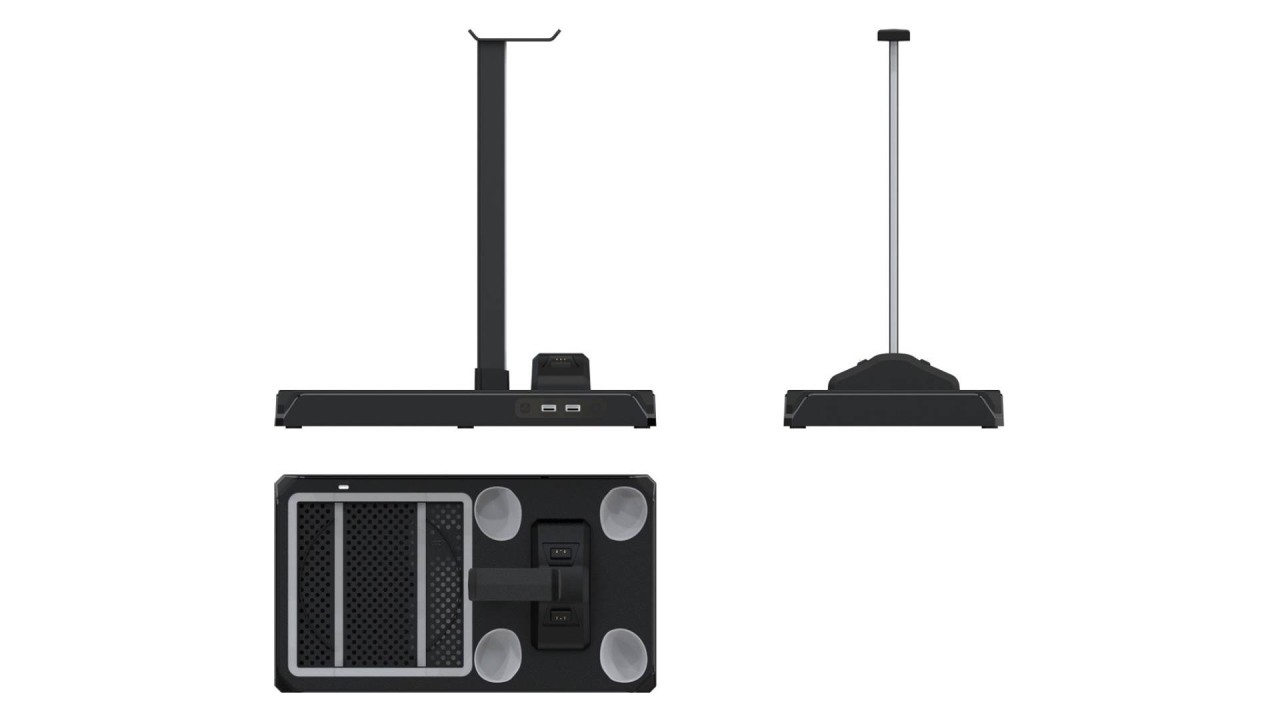 Vertical headphone stand allows easy access to gaming headphones.