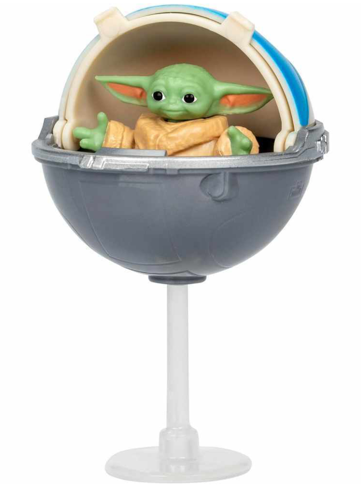 Această jucărie Grogu include un cărucior plutitor cu suport și dispune de multiple puncte de articulare pentru a fi poziționat în diferite moduri.
