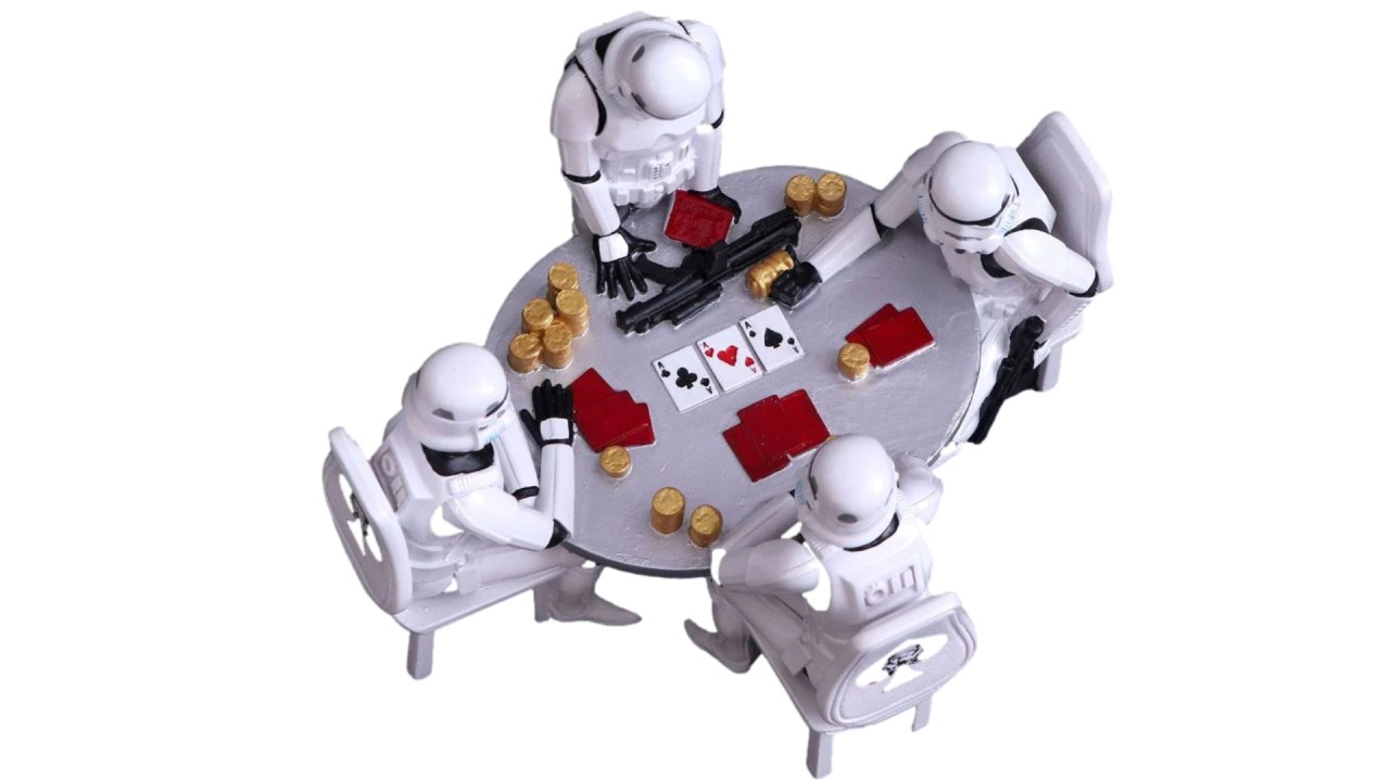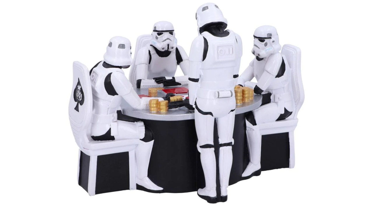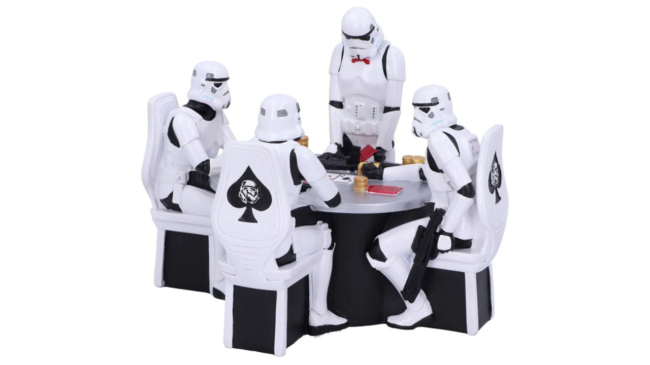 Cast in high-quality polyresin before being expertly hand-painted, this figure features three Stormtroopers seated around a poker table, while one of them plays the role of dealer (notice the red bow tie).