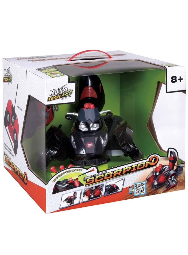 Motocicleta poate fi transformată într-un robot de luptă care trage rachete, cu un aspect inspirat de un scorpion.