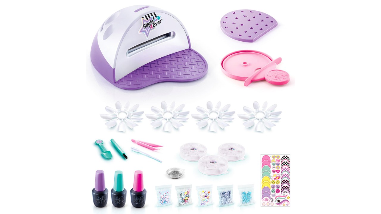 Acesta include trei lacuri de unghii vibrante în turcoaz, violet și roz, împreună cu sclipici, autocolante și instrumente de unghii.