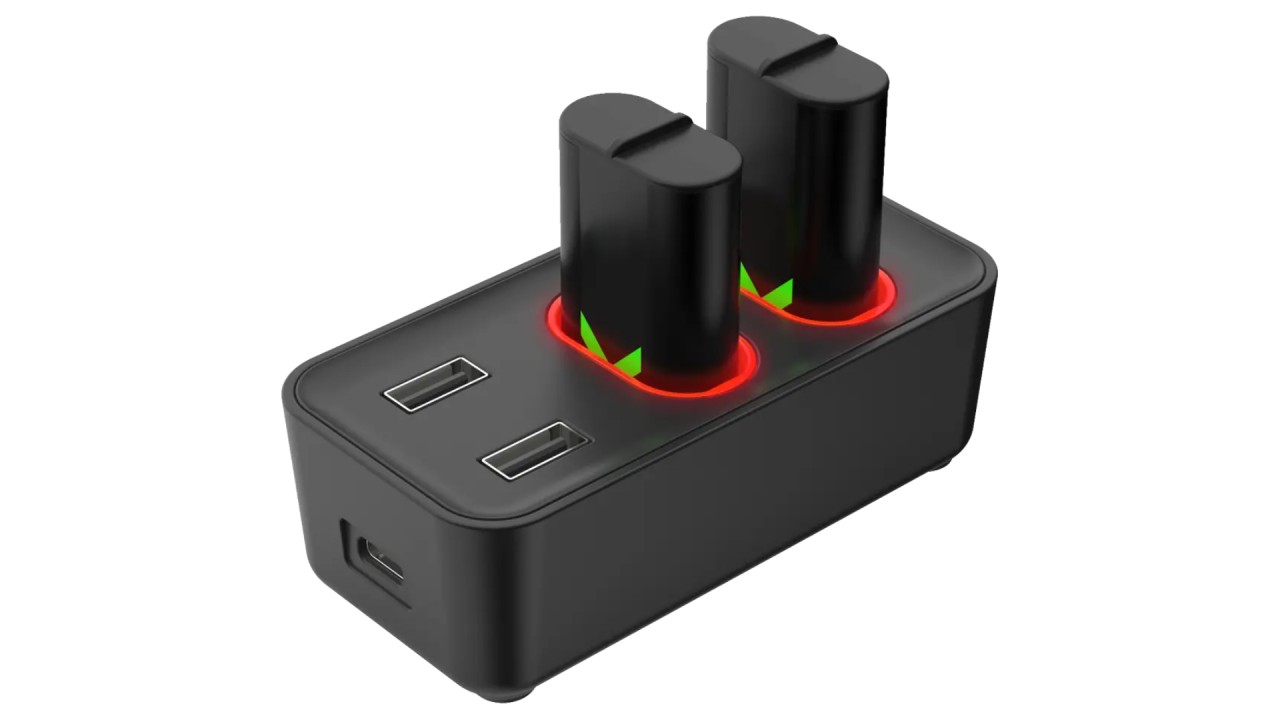 The charger uses rechargeable batteries, which are usually included in the package, and ensures fast and efficient charging.