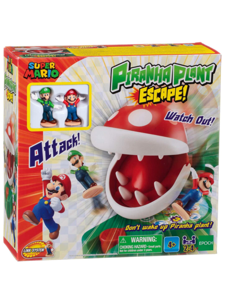 Jocul include o bază Piranha Plant ușor de asamblat cu tablă de joc, 2 figurine unice Super Mario, inclusiv Super Mario și Luigi, 2 plăci cu personaje cu autocolante Yoshi și Toad și un zar de joc.