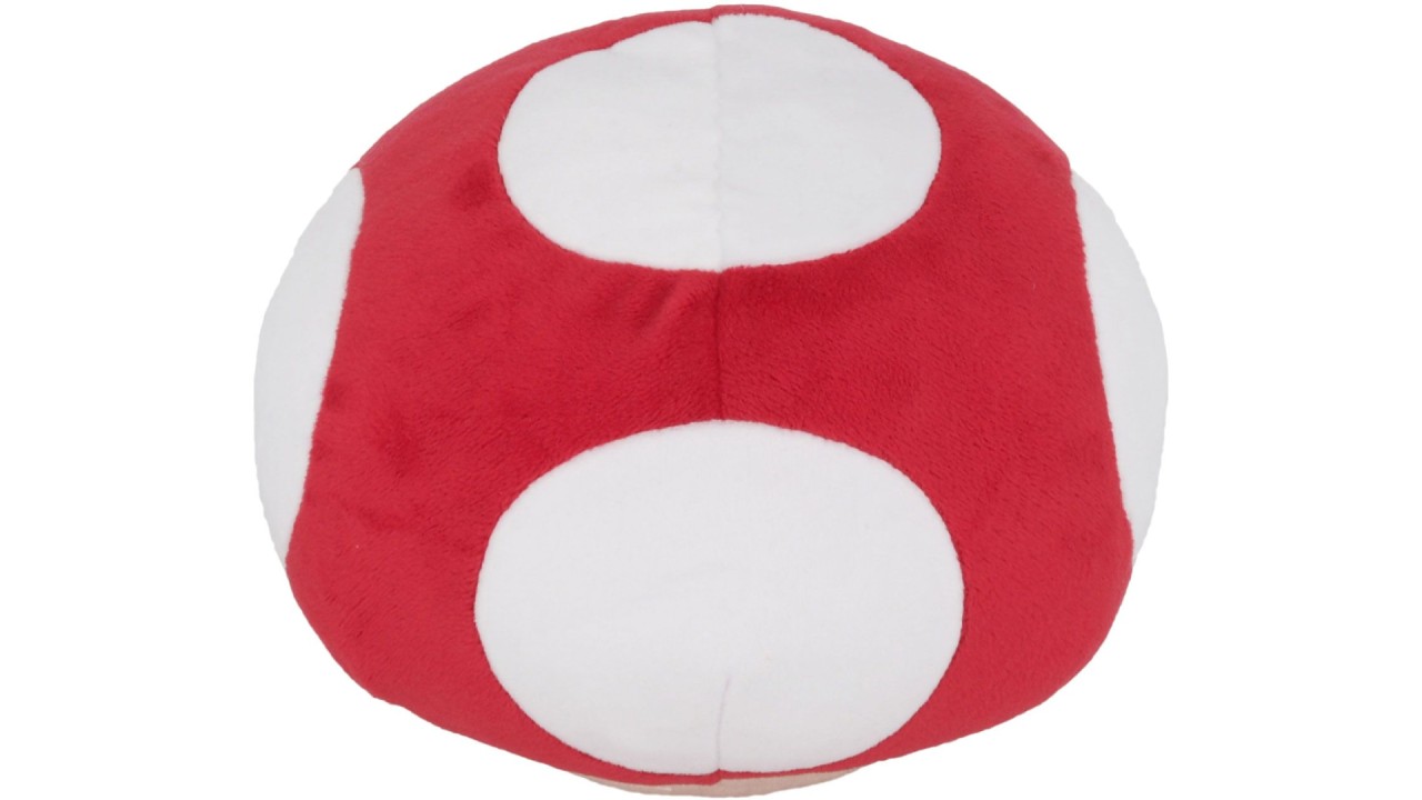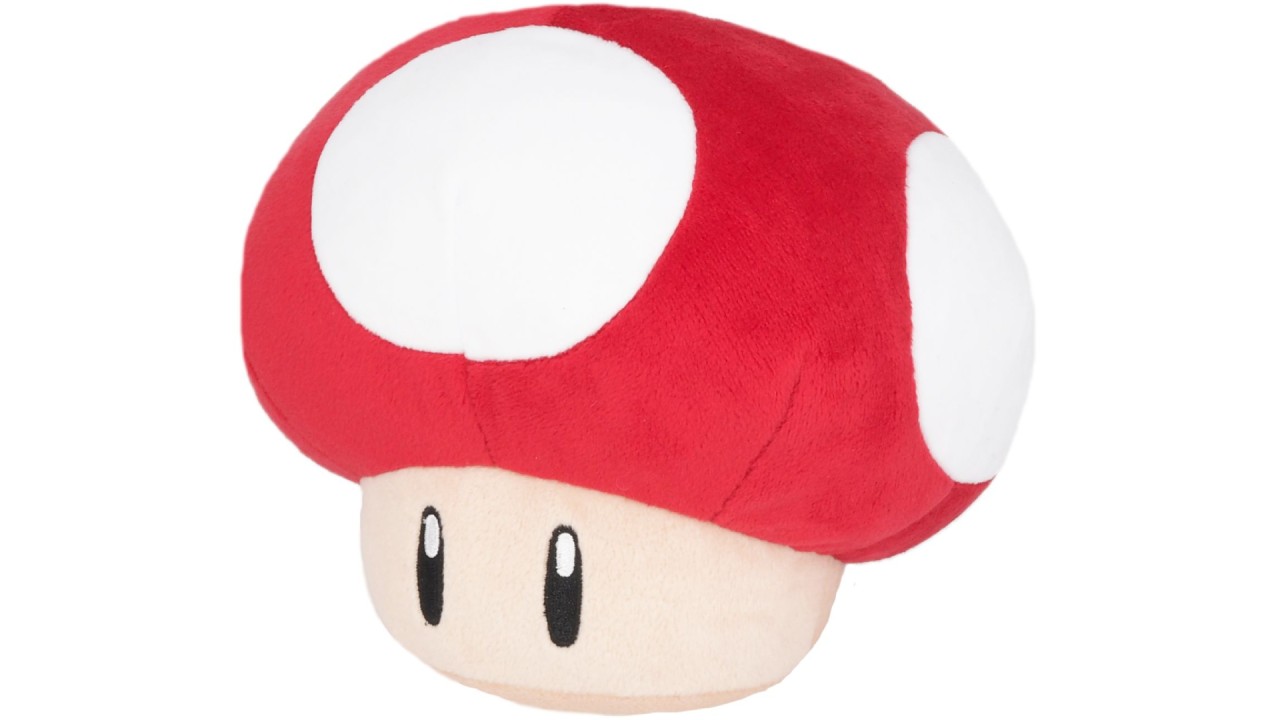 The vibrant colors and details of the Super Mushroom plush pay homage to the game's legendary item, from its iconic mushroom shape to its bright red and white colors.