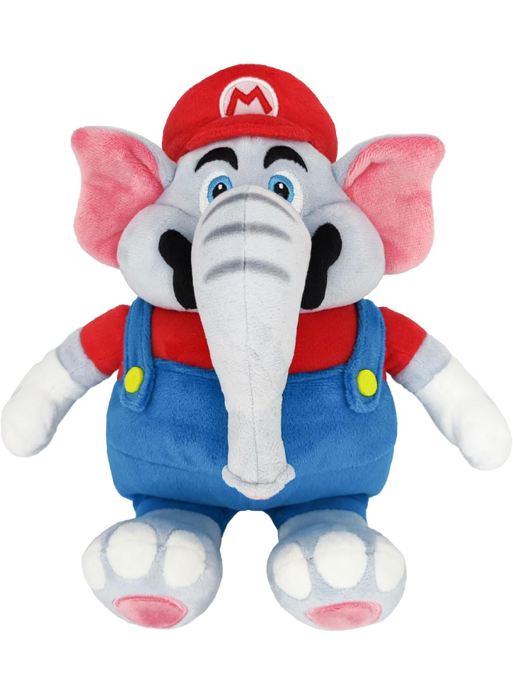 Culorile vibrante și detaliile meticuloase ale plușului Elephant Mario aduc un omagiu unei variante unice a faimosului instalator italian, de la salopeta sa albastră la șapca sa roșie împodobită cu litera M și, desigur, cu transformarea sa caracteristică de elefant.