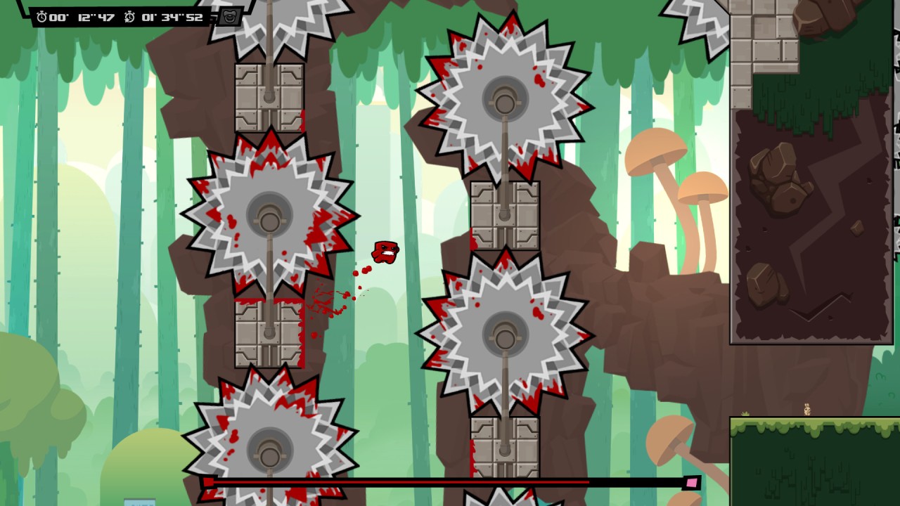 Super Meat Boy's challenge returns in Super Meat Boy Forever and this time, Meat Boy is always running, he is literally a self-runner.