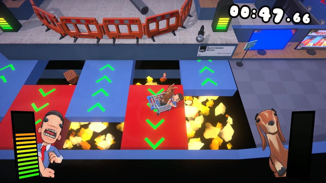 Behind each shopfront, expect a relentless stream of obstacles blocking your way to the checkout! From the mundane (conveyor belts, spillages) to the absurd (fire pits, swinging axes, sumo wrestlers & more!).