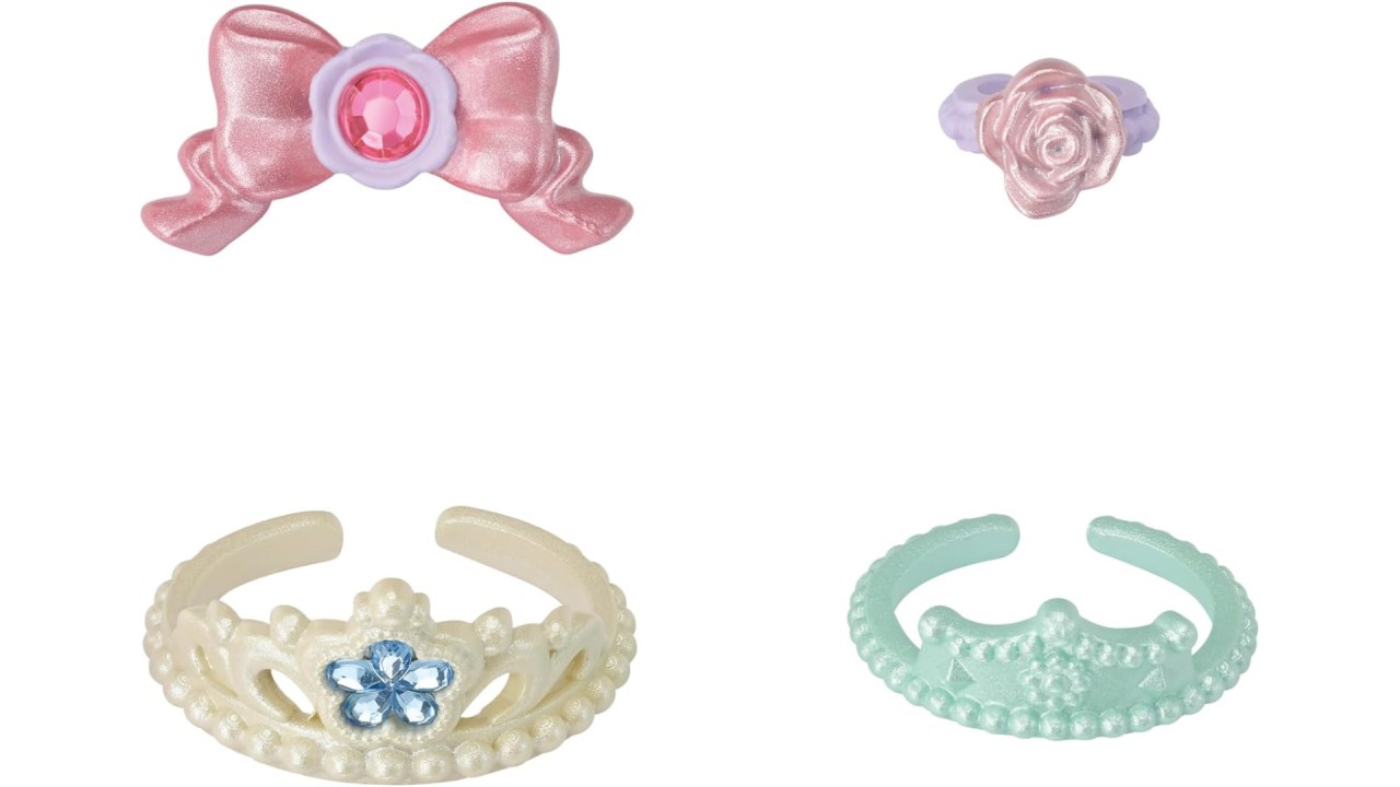 Fiecare figură este îmbrăcată în rochii de prințesă cu flori și vine cu accesorii precum tiara, panglică, tiara mică și cercei.